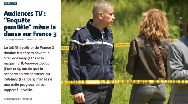 Le téléfilm policier Enquête parallèle s’est hissé en tête des audiences du samedi soir sur France 3, devant Star Academy(TF1) et Échappées belles (France 5), confirmant un excellent lancement et l’intérêt du public pour ce nouveau programme.